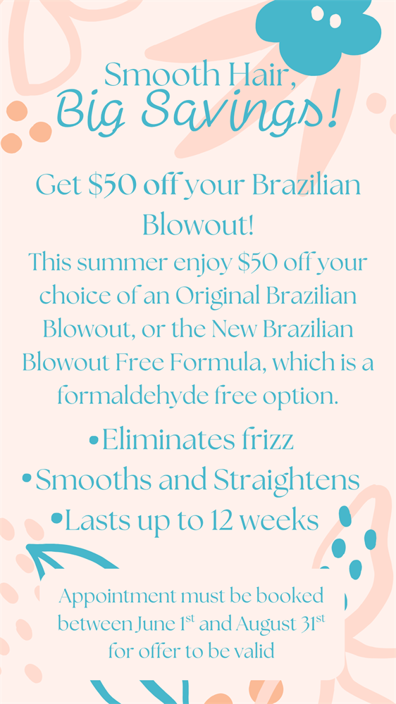 Get $50 off A Brazilian Blowout Between June 1st And August 31st!